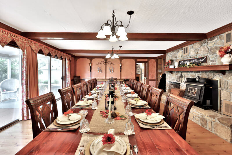 This sprawling country home has 4 bedrooms on the main level! Love to entertain? How about holidays at your place in the gorgeous, fireside dining room with a custom-made banquet table and chairs for 18 people, all included!